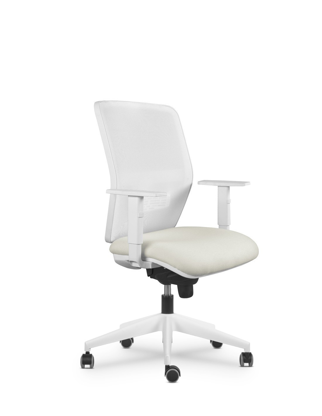 Silla Operativa Kerry Carcasa Blanca. Sistema Sincro Respaldo Malla colores a elegir. Asiento tapizado colores a elegir. Asiento de goma flexible de alta densidad de 30 kgs/m3. Brazos Opcionales