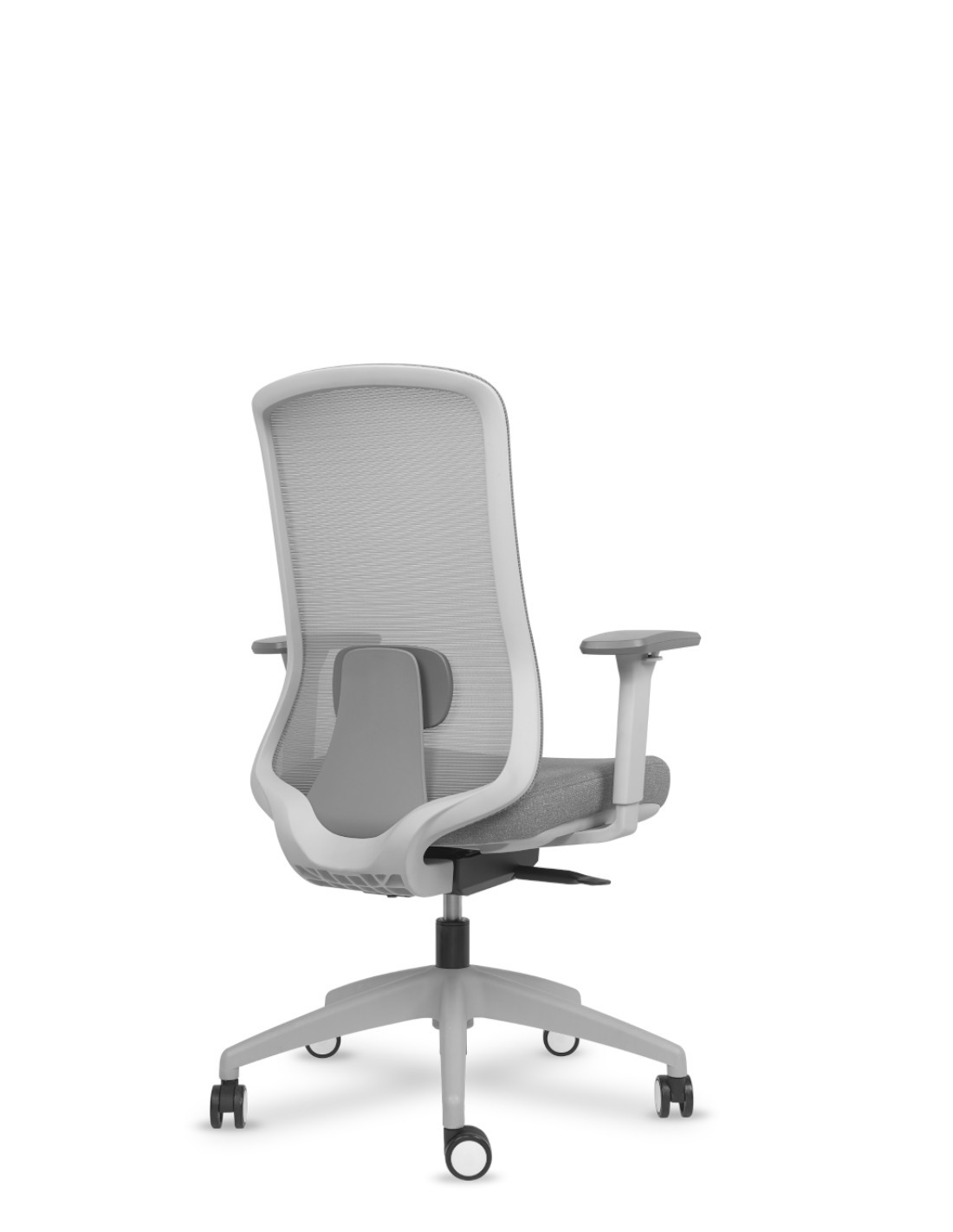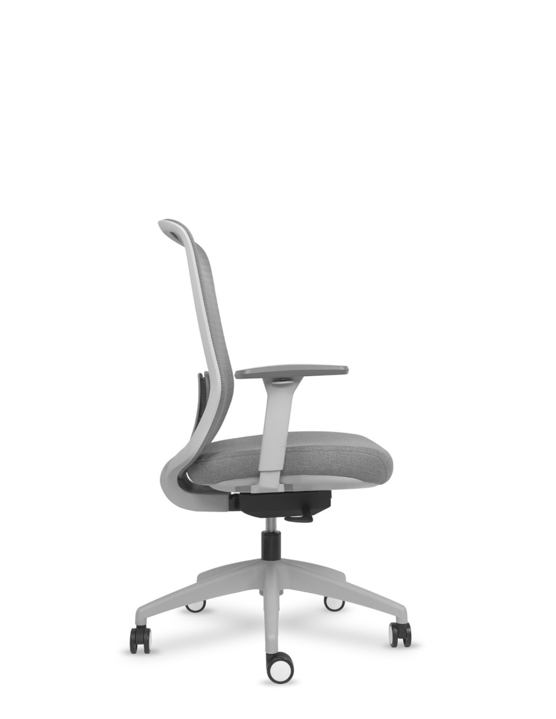 Respaldo en malla color gris. Asiento tapizado de serie en color gris.