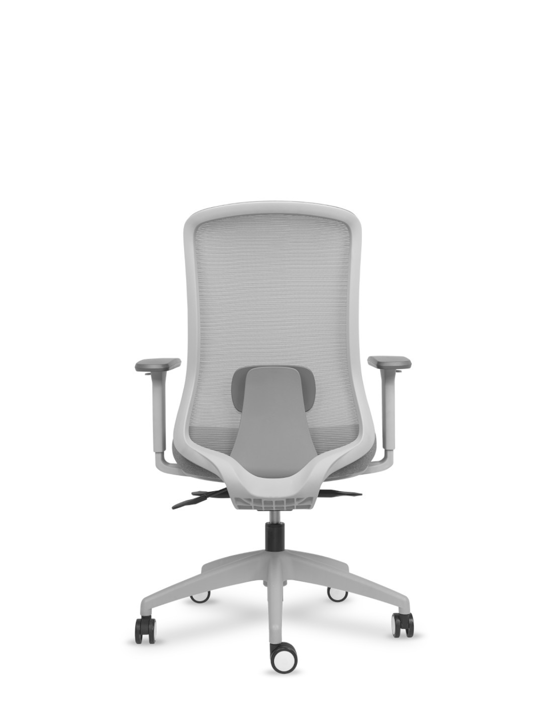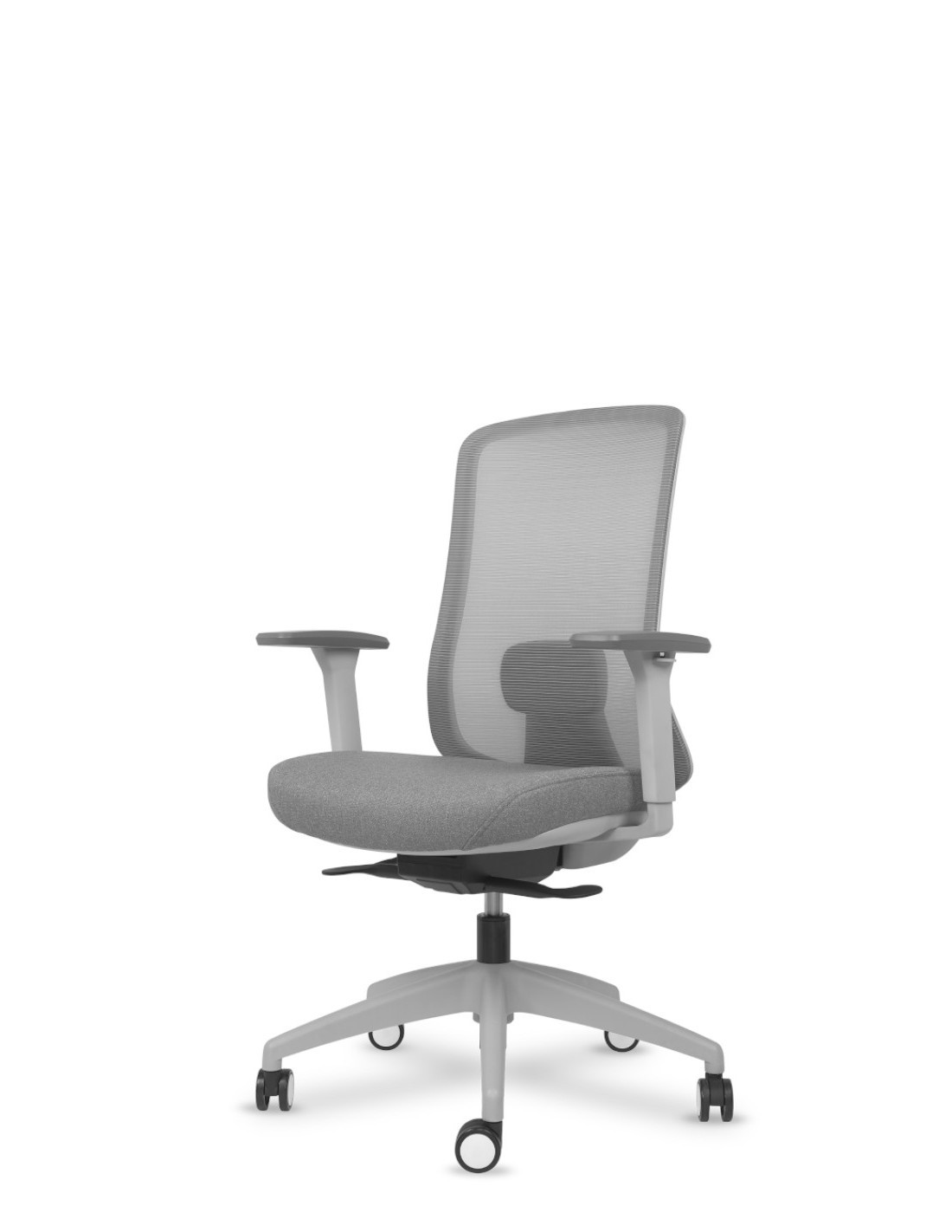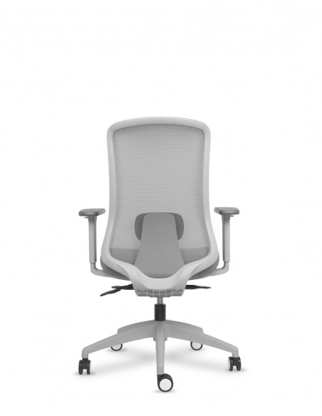 Silla Operativa Respaldo Malla Gris, Brazos 3D + anchura integrados. Asiento de goma flexible de alta densidad de 50 kgs/m3. Acabado Gris Claro.